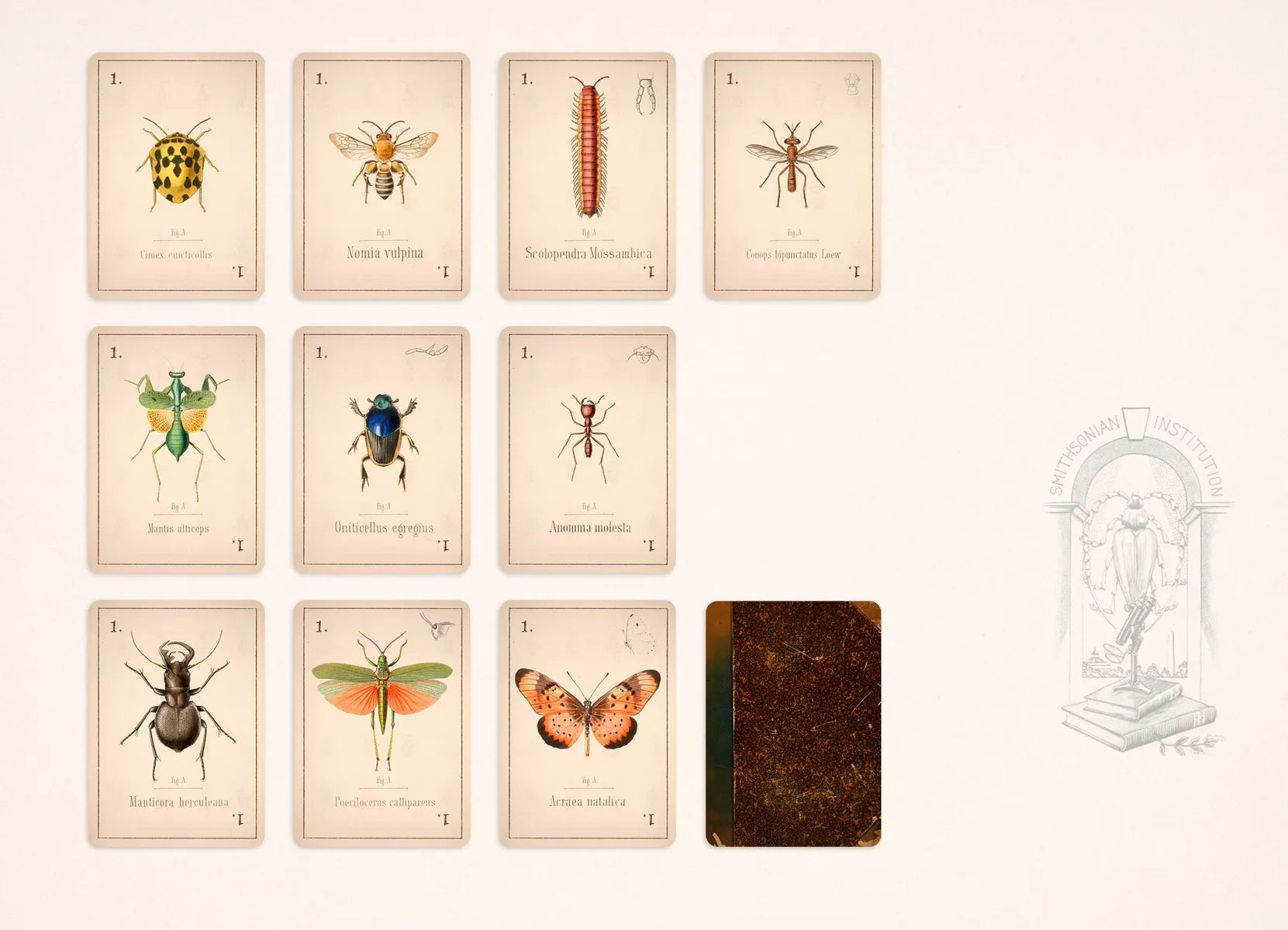 The deck has 80 cards in ten different colors, with each color featuring a different species of tree; each color has cards numbered 1 through 8, and the number of colors used depends on the number of players. Players start with a hand of seven cards. On each turn, a player draws two cards (from the deck or one or more of the discard piles), lays a card on the table as part of her arboretum, then discards a card to her personal discard pile.
