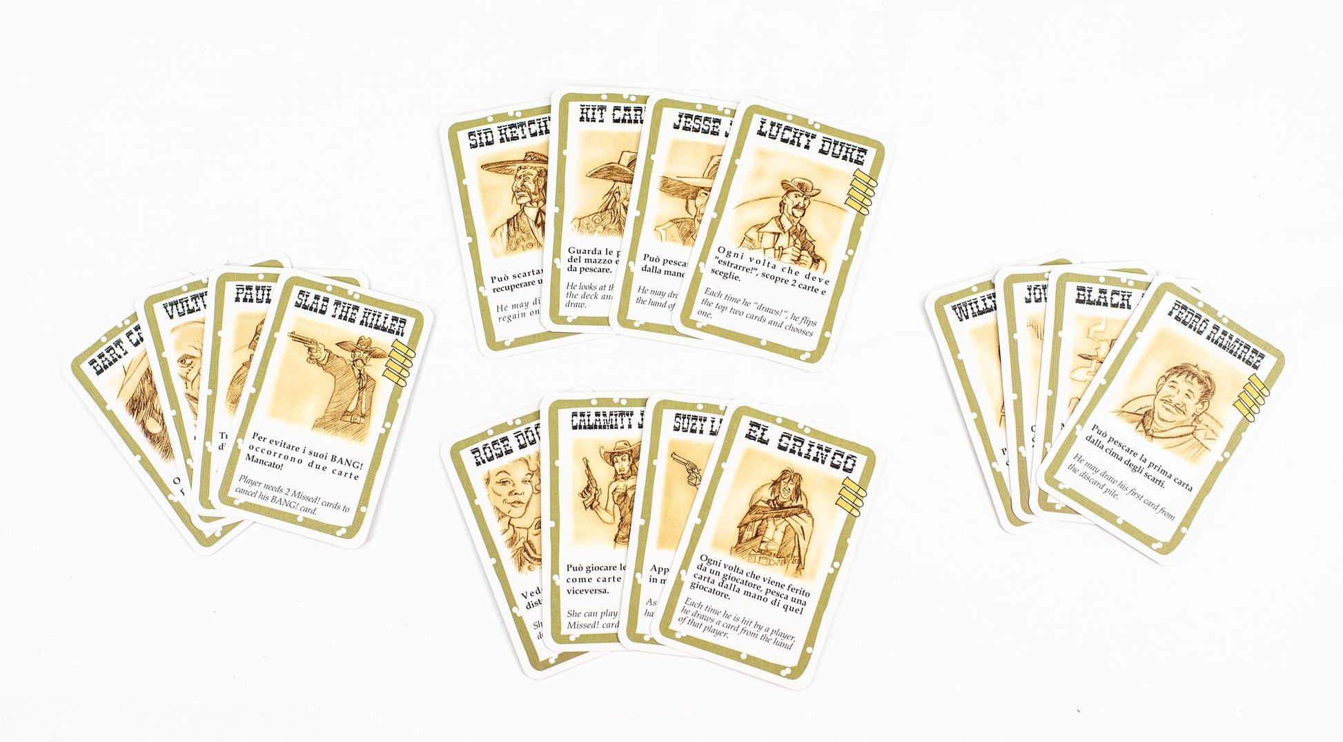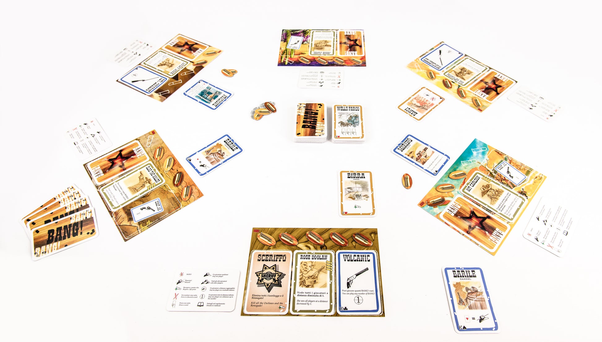 Contents: 7 role cards (1 Sheriff, 2 Deputies, 3 Outlaws, 1 Renegade), 16 characters, 80 playing cards, 7 overview cards, 7 game boards, 30 bullet tokens, and game rules.