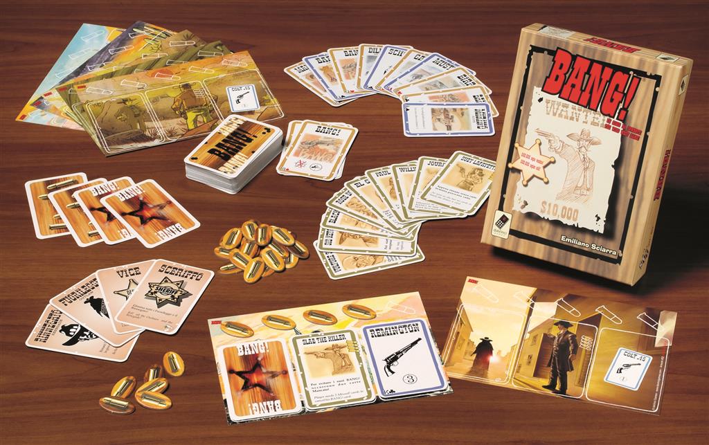 Bang! is a fast paced card game with a Western twist! Each player has a face-up character card, which determines how many hits it takes to kill them and grants them a special action. In addition, each player is assigned a role: sheriff, deputy sheriff, outlaw, or renegade. With the exception of the sheriff, the roles remain secret. Can you trust that the player next to you isn't lying about being a Deputy? It's up to you to uncover your enemies and aim your revolver true.