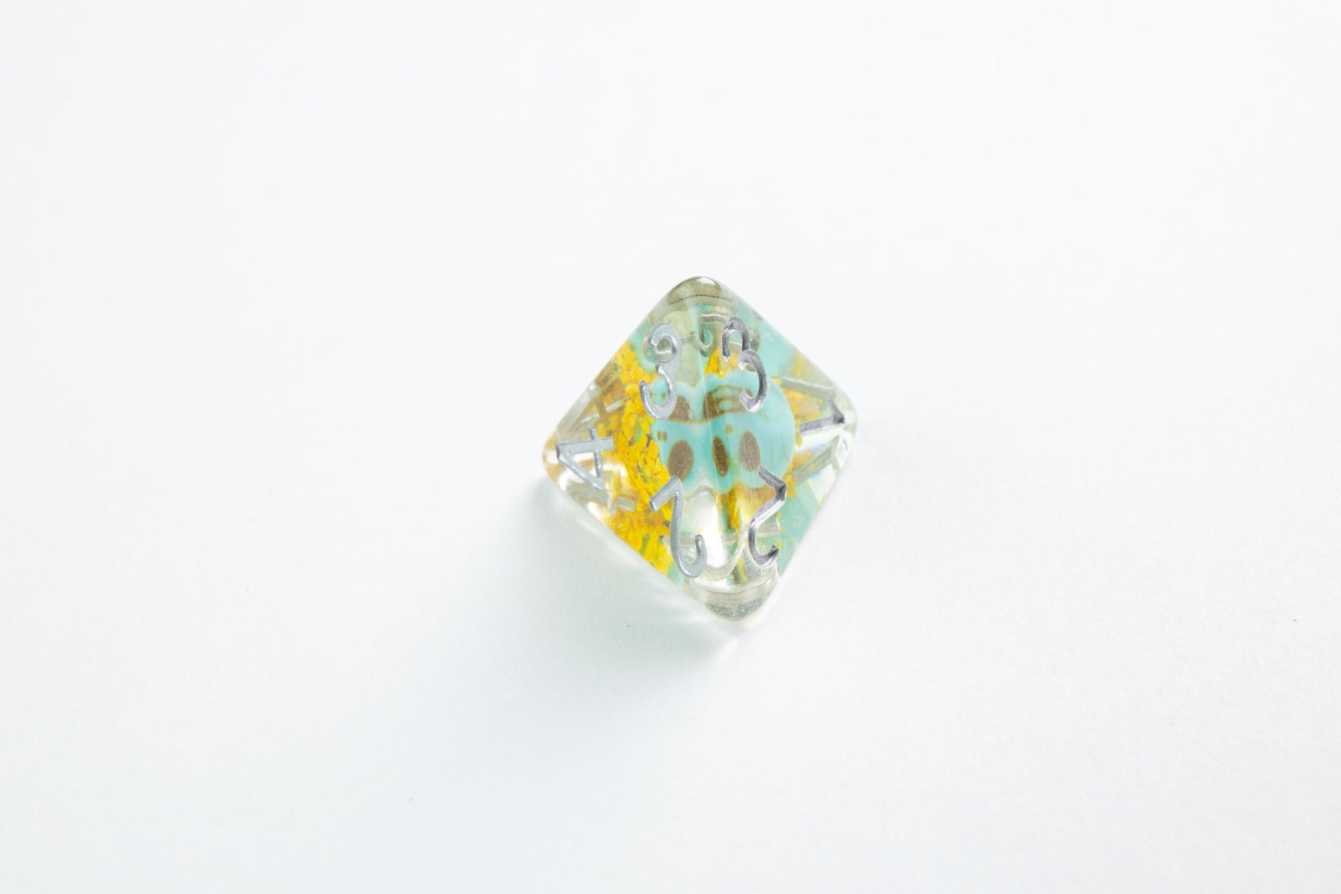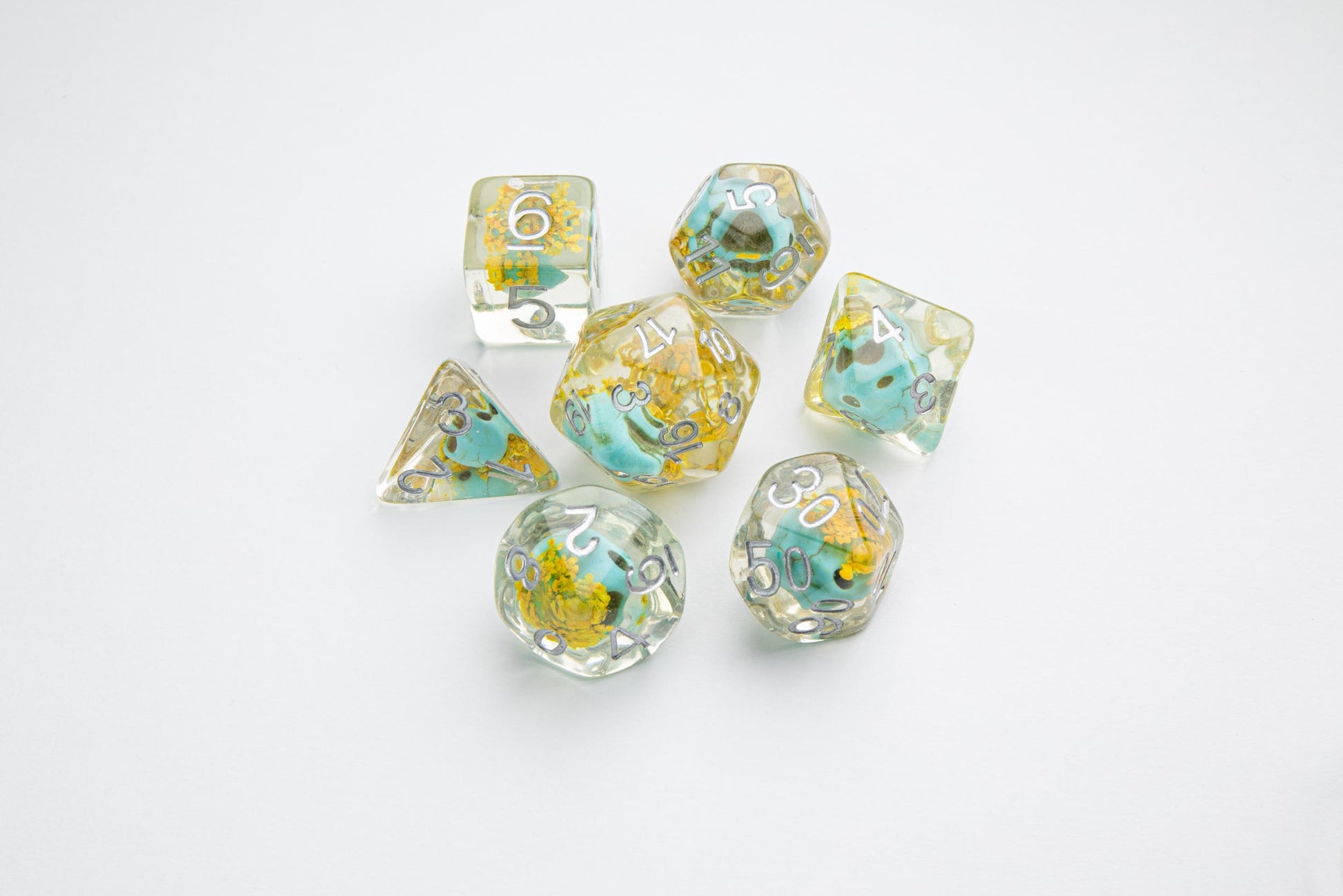 Een set van 7 RPG dobbelstenen met een grappig voorwerp binnenin. Deze set bevat een D4, D6, D8, 2x D10, D12 en een D20.