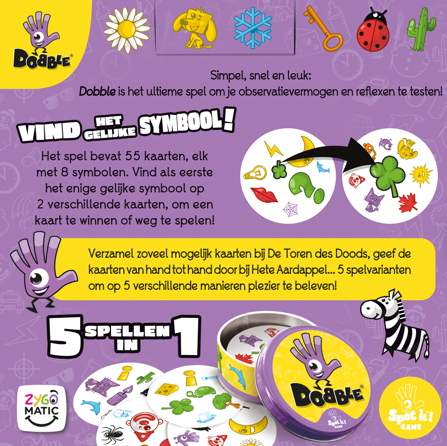Dobble includes 55 cards, each featuring 8 different symbols. You can play 5 different mini-games with them, each with its own set of rules.