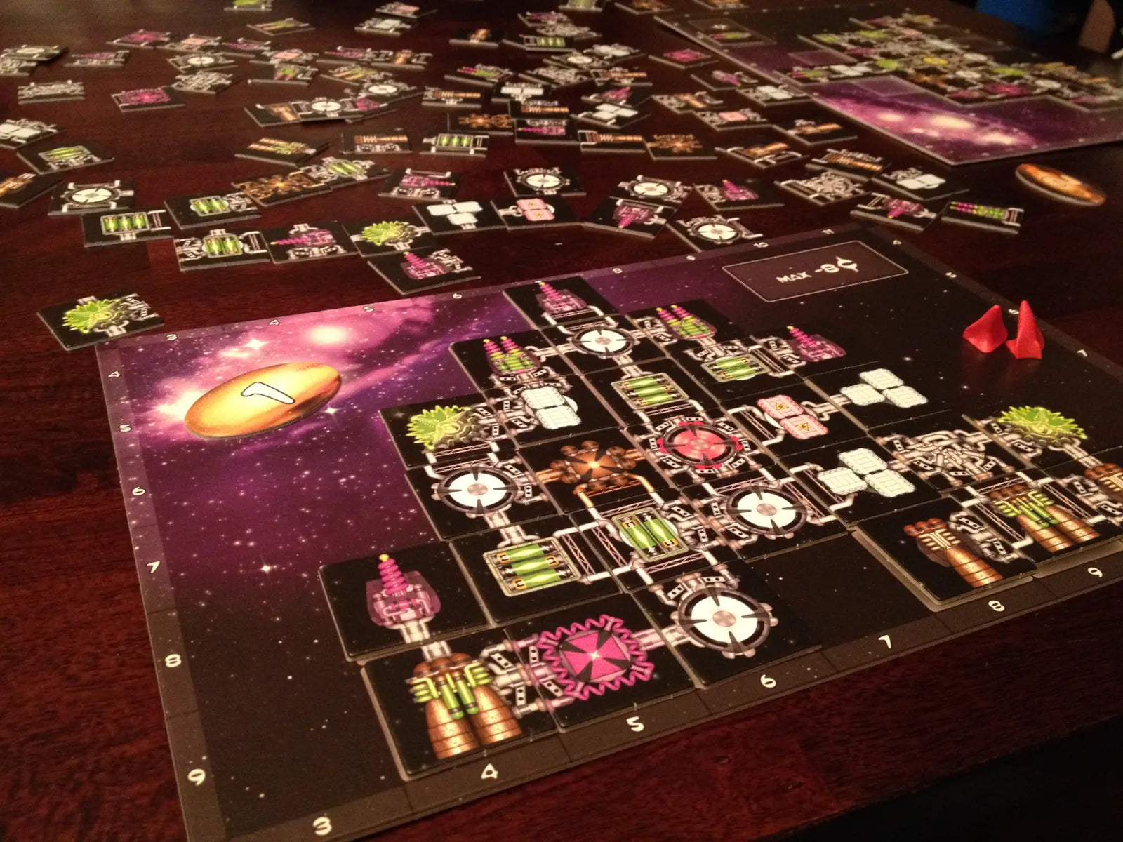 In this fast and goofy family game, 2 to 4 players begin by simultaneously rummaging through the common warehouse, frantically trying to grab the most useful component tiles for building their space ship—all in real-time.