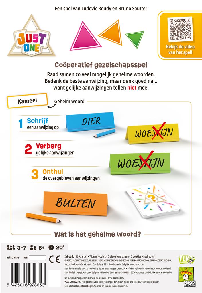 Just One is een coöperatief gezelschapsspel waarbij je samen met de andere spelers zoveel mogelijk mysterieuze woorden probeert te raden! Vind de beste aanwijzing om je medespeler te helpen en wees origineel want identieke aanwijzingen worden geschrapt.
