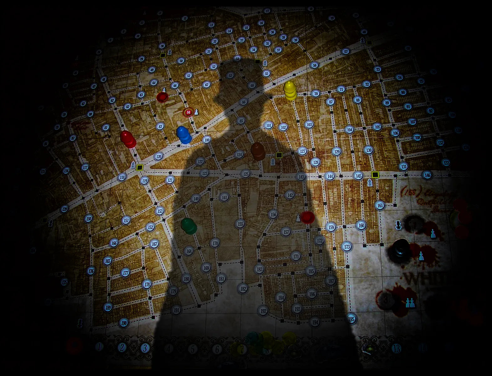 The board game Letters from Whitechapel, which plays in 90-150 minutes, takes the players right there. One player plays Jack the Ripper, and his goal is to take five victims before being caught. The other players are police detectives who must cooperate to catch Jack the Ripper before the end of the game. The game board represents the Whitechapel area at the time of Jack the Ripper and is marked with 199 numbered circles linked together by dotted lines. During play, Jack the Ripper, the Policemen, and the Wretched are moved along the dotted lines that represent Whitechapel's streets. Jack the Ripper moves stealthily between numbered circles, while policemen move on their patrols between crossings, and the Wretched wander alone between the numbered circles.