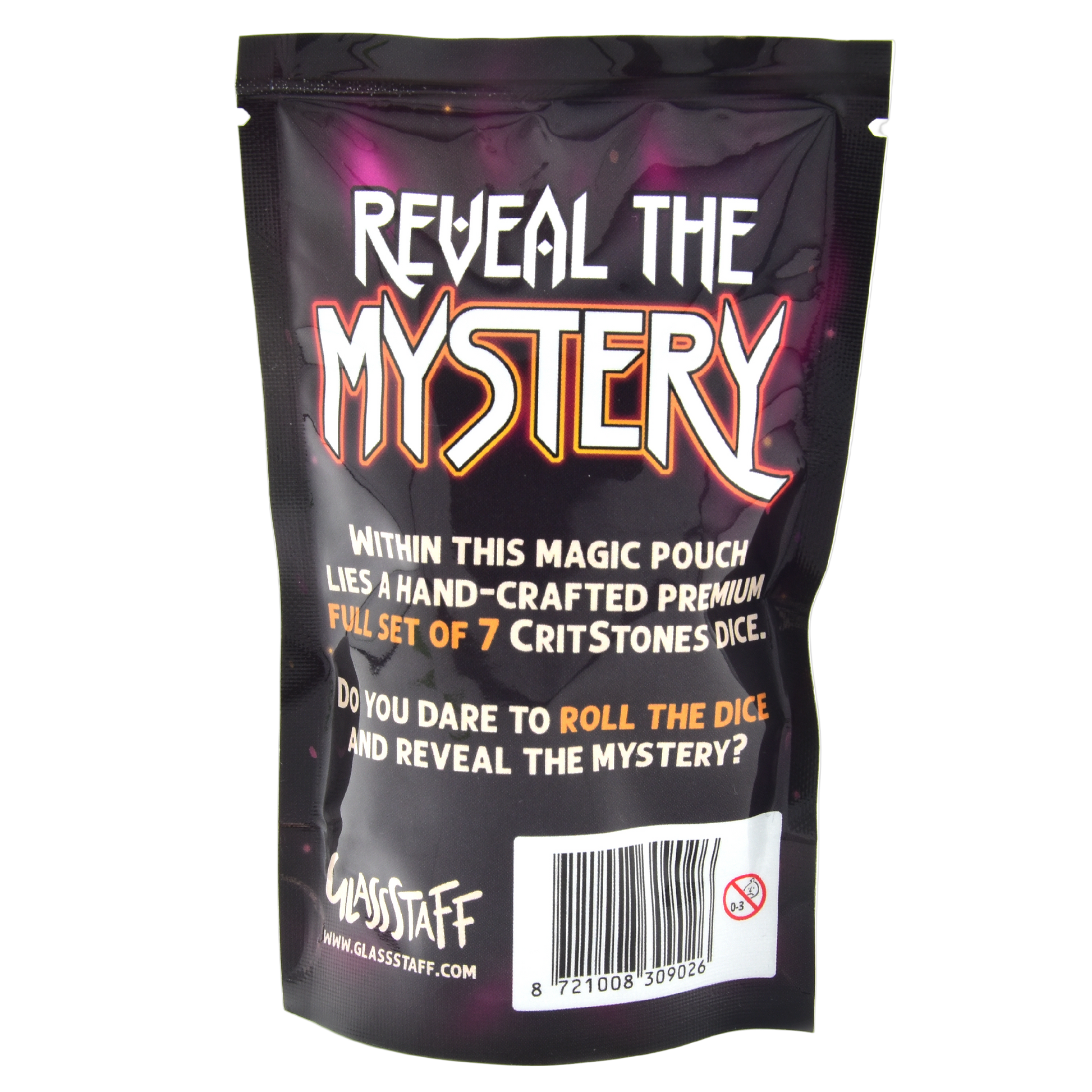 Do you dare to roll the dice and reveal the Mystery? This pouch contains one premium CritStones set, waiting to be revealed by brave explorers. It can contain any of our dice sets in any style and color. Metal, Liquid Core, Hollow Metal, Glass, Real Mineral, Sharp Edged Resin, they could all be in there. Any of our €40,- to €125,- sets could be waiting for you! Let's roll the dice!
