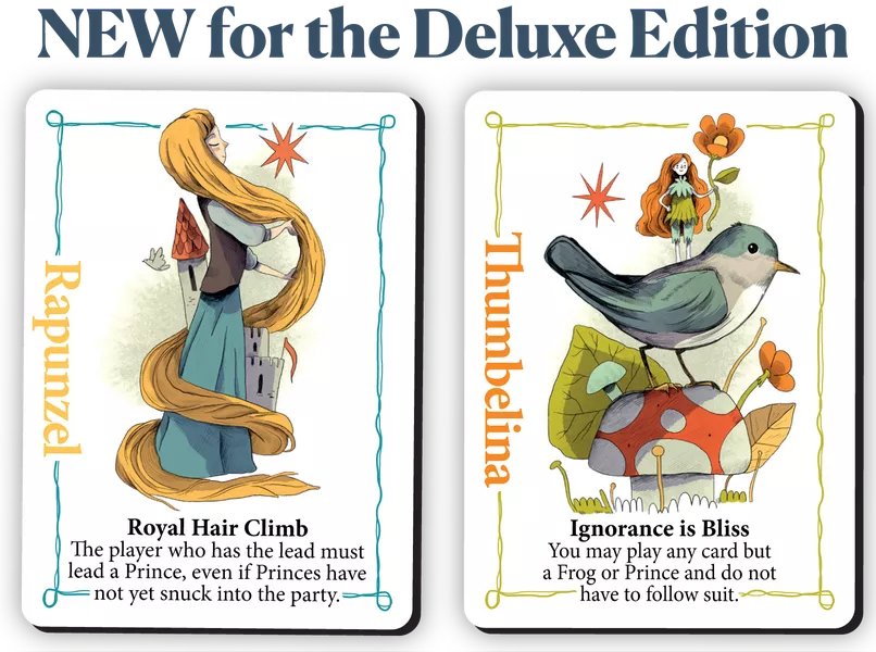 Instead of avoiding Hearts, players are avoiding Prince Cards as they each represent one marriage proposal. Beware the very eager Frog Prince who’s worth 5 marriage proposals! Receive the fewest marriage proposals and become the legendary Rebel Princess.