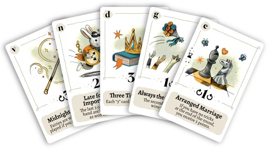 Each game consists of 5 rounds (one for each day of the ball). Each round adds a unique twist to the ruleset, keeping players on their toes (glass-slippered or otherwise).