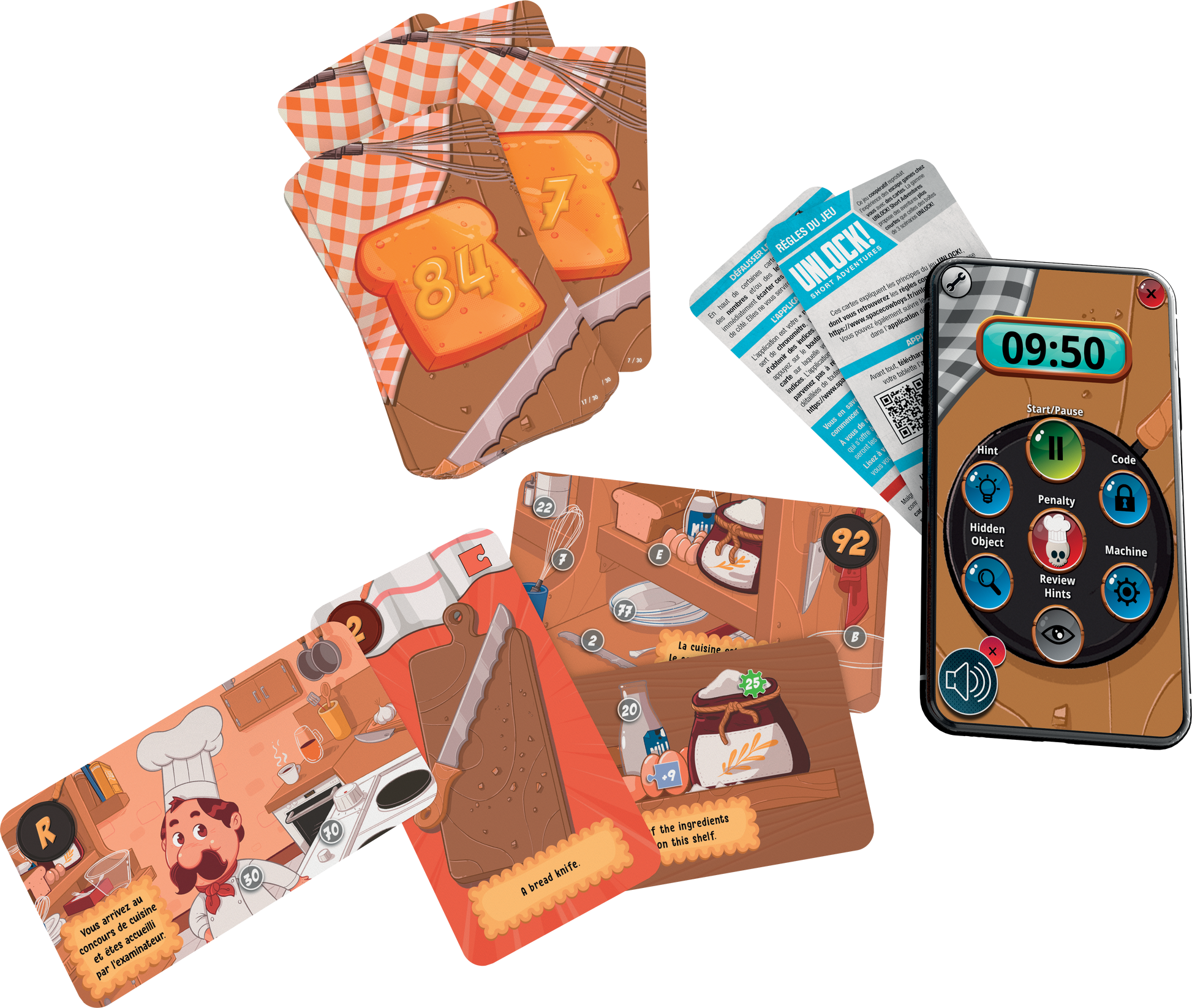 Unlock! Short adventures is a series of escape adventures for up to six players. With 30 to 45 minutes on the clock, players work through a deck of 30 cards as a team, searching for clues, combining objects, and solving puzzles. The free Unlock! companion app runs the timer while also providing clues, offering hints, and confirming successes. Once the team has reached a solution and entered the correct code into the app, they will escape and win the game!